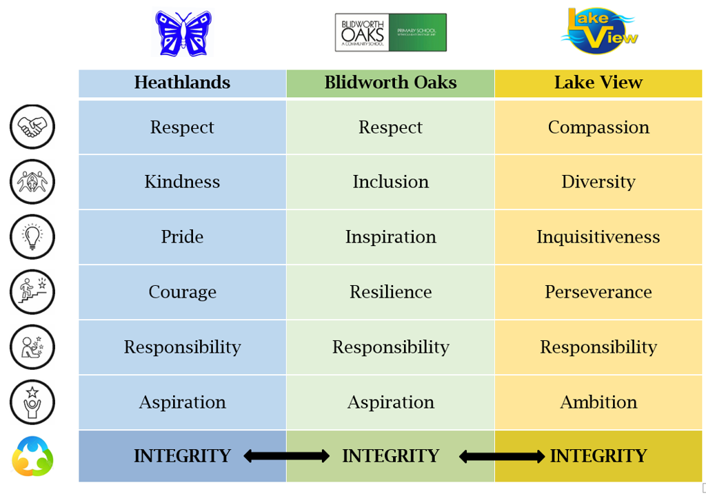 Each of our schools has a set of Values that set out how we expect our school communities - staff, parents, pupils and partners - to conduct themselves in delivering our vision for our schools and our partnership. Each set of Values is unique, but also bound together in our value families and linked by our partnership Value: INTEGRITY. With integrity we will deliver our vision for education in the Blidworth and Rainworth area.