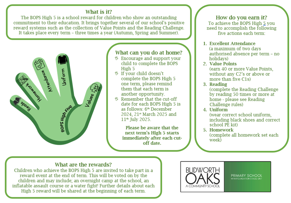 The BOPS High 5 is our termly reward for children who work hard, attend well and always show our school values. This is an exciting reward that really engages our children with wanting to do well at school. Please see below for more details.