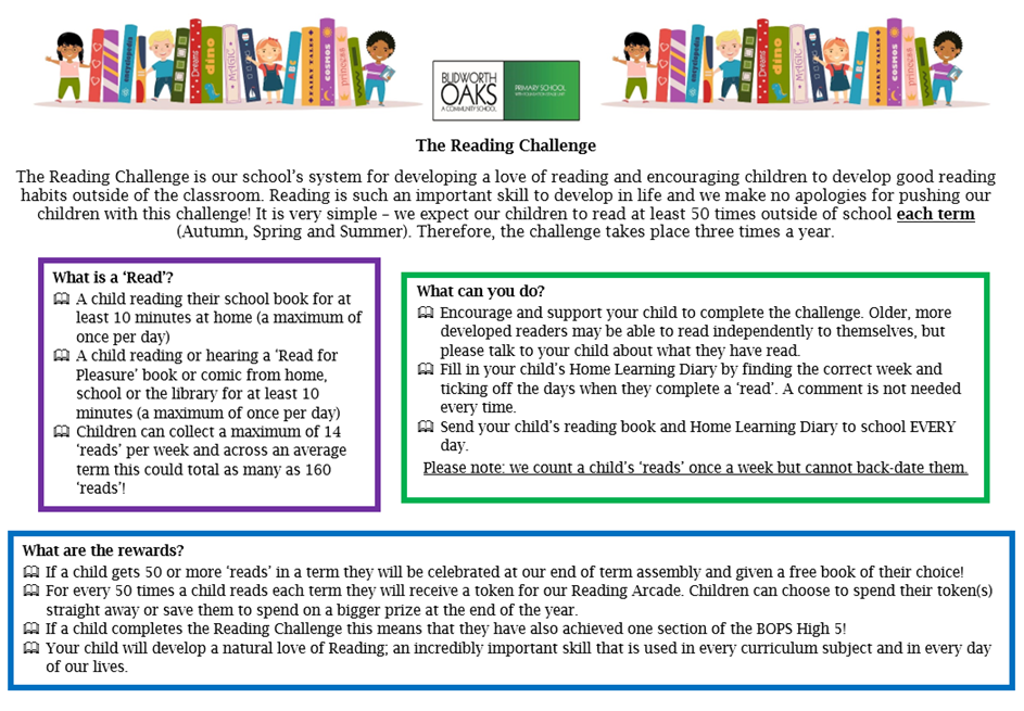 At Blidworth Oaks we hold a termly Reading Challenge to engage children with reading outside of school time.